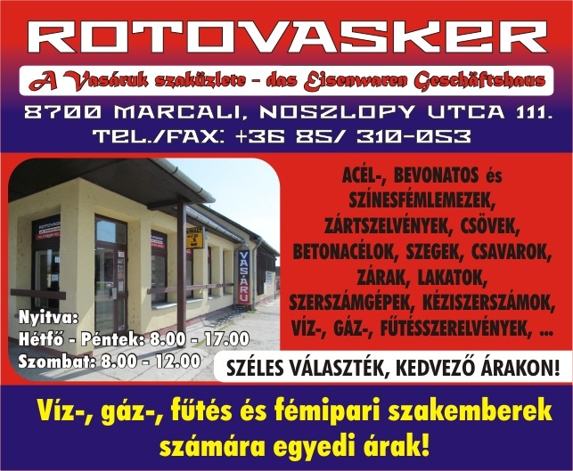 Üdvözöljük a Rotovasker vaskereskedés honlapján. Üzletünk Marcaliban található, közvetlenül a 68-as főút mellett, ezáltal a megközelítés rendkívül egyszerű. Rendezett, tehergépkocsival is használható parkolóval várunk minden hozzánk érkező vásárlót. Munkatársaink készséggel és több éves tapasztalattal állnak a vásárlók rendelkezésére. A lakossági vásárlók igényei mellett az utóbbi években előtérbe kerültek a közületi megbízók, önkormányzatok is. Filozófiánk a megbízhatóság, szakértelem és garancia, mely lehetővé teszi, hogy a magánszemélyeknél is, és az építőipari vállalkozóknál, szerelőknél is, élvonalban maradjunk a szolgáltatásainkkal. Vaskereskedésünk mindenféle vasanyagot kínál, legyen az akár házépítés, kerítés építés vagy barkácsolás. |